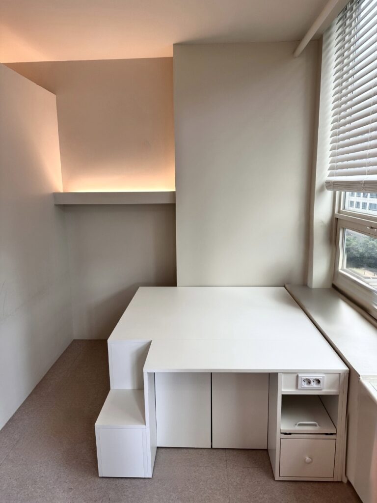 수평으로 넓게 펼쳐진 단상의 면(面)은 단조로운 공간에 층차를 만들어내며 시각적 리듬감을 부여합니다. 절제된 직선의 실루엣은 어떤 인테리어와도 조화롭게 어우러지며, 샵의 품격을 지탱하는 묵직한 바탕이 됩니다.